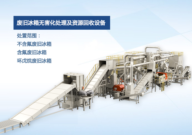 公司自主研發(fā)的廢舊冰箱無害化處理及資源回收技術及設備, 獨具 “雙軸撕碎機+立式破碎機+大風量稀釋環(huán)戊烷氣體”的專利組合設計, 主要用于對廢舊冰箱中的各種原材料進行分離、 回收和利用, 具有自主知識產(chǎn)權, 經(jīng)國家工業(yè)和信息化部科技成果鑒定為 “填補國內(nèi)空白, 達到國際先進水平” 。